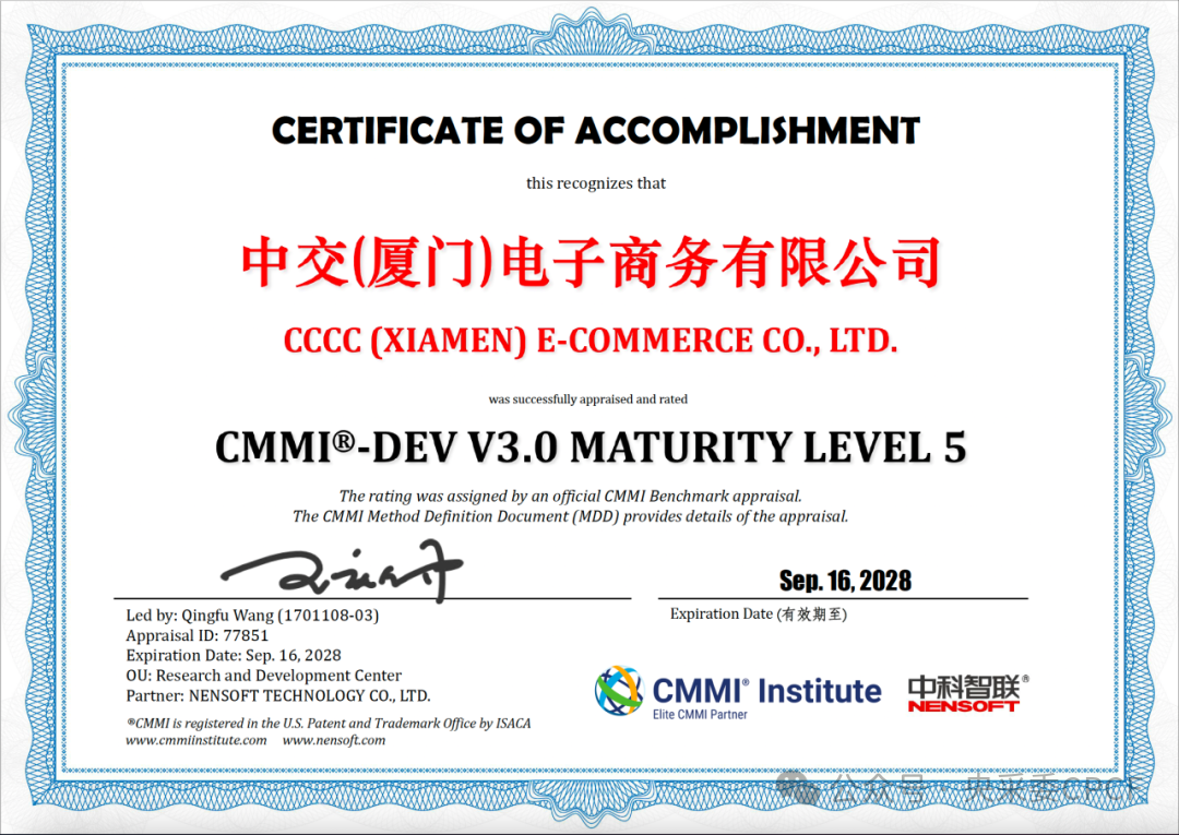 近日,中交(厦门)电子商务有限公司(以下简称“电商公司”)顺利通过国际软件能力成熟度模型集成(CMMI)五级认证,并正式取得认证证书。这一重要成果标志着电商公司在软件研发能力、项目交付质量及持续创新能力等方面均已达到国际领先水平,为央企数字化转型和市场化改革树立了行业标杆。